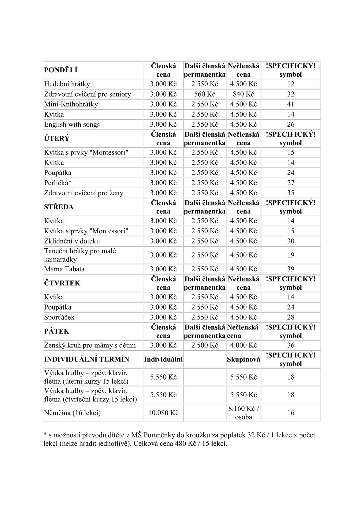 ZDE CENÍK PRAVIDELNÝCH AKTIVIT NA 1. POLOLETÍ 2026 (02/2026 - 06/2026):